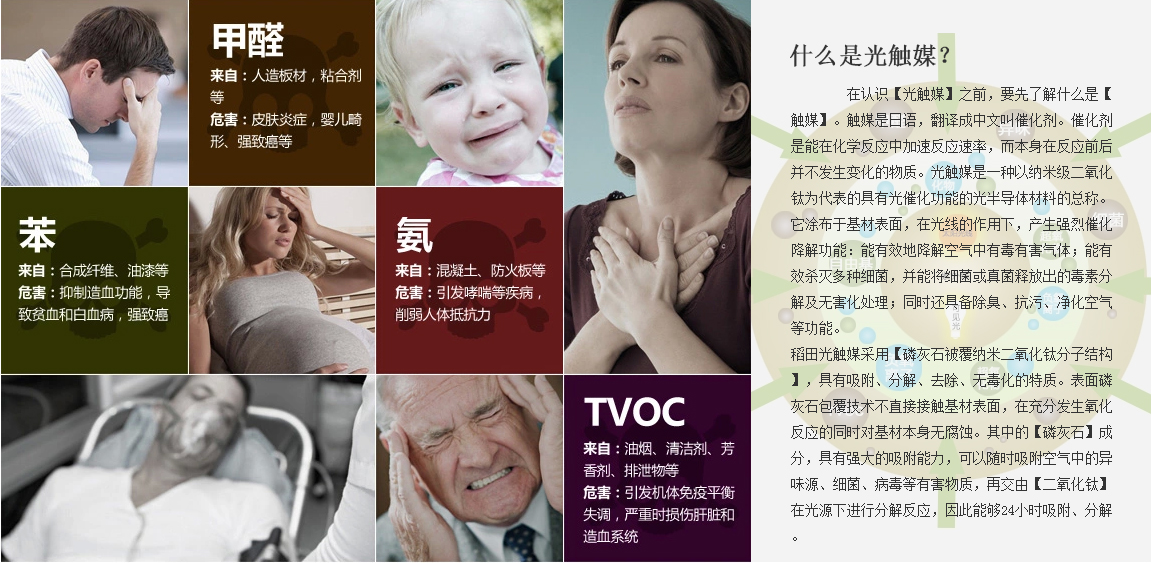 在認(rèn)識(shí)【光觸媒】之前,要先了解什么是【觸媒】。觸媒是日語(yǔ),翻譯成中文叫催化劑。催化劑是能在化學(xué)反應(yīng)中加速反應(yīng)速率,而本身在反應(yīng)前后并不發(fā)生變化的物質(zhì)。光觸媒是一種以納米級(jí)二氧化鈦為代表的具有光催化功能的光半導(dǎo)體材料的總稱(chēng)。它涂布于基材表面,在光線的作用下,產(chǎn)生強(qiáng)烈催化降解功能:能有效地降解空氣中有毒有害氣體;能有效殺滅多種細(xì)菌,并能將細(xì)菌或真菌釋放出的毒素分解及無(wú)害化處理;同時(shí)還具備除臭、抗污、凈化空氣等功能。 稻田光觸媒采用【磷灰石被覆納米二氧化鈦分子結(jié)構(gòu)】,具有吸附、分解、去除、無(wú)毒化的特質(zhì)。表面磷灰石包覆技術(shù)不直接接觸基材表面,在充分發(fā)生氧化反應(yīng)的同時(shí)對(duì)基材本身無(wú)腐蝕。其中的【磷灰石】成分,具有強(qiáng)大的吸附能力,可以隨時(shí)吸附空氣中的異味源、細(xì)菌、病毒等有害物質(zhì),再交由【二氧化鈦】在光源下進(jìn)行分解反應(yīng),因此能夠24小時(shí)吸附、分解
